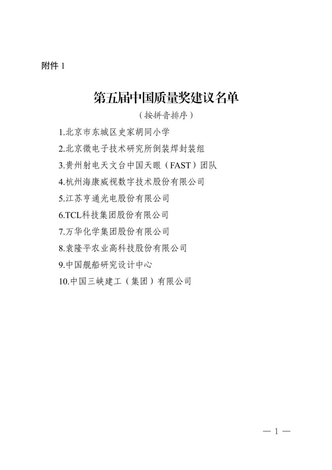附件:1.第五届中国质量奖建议名单