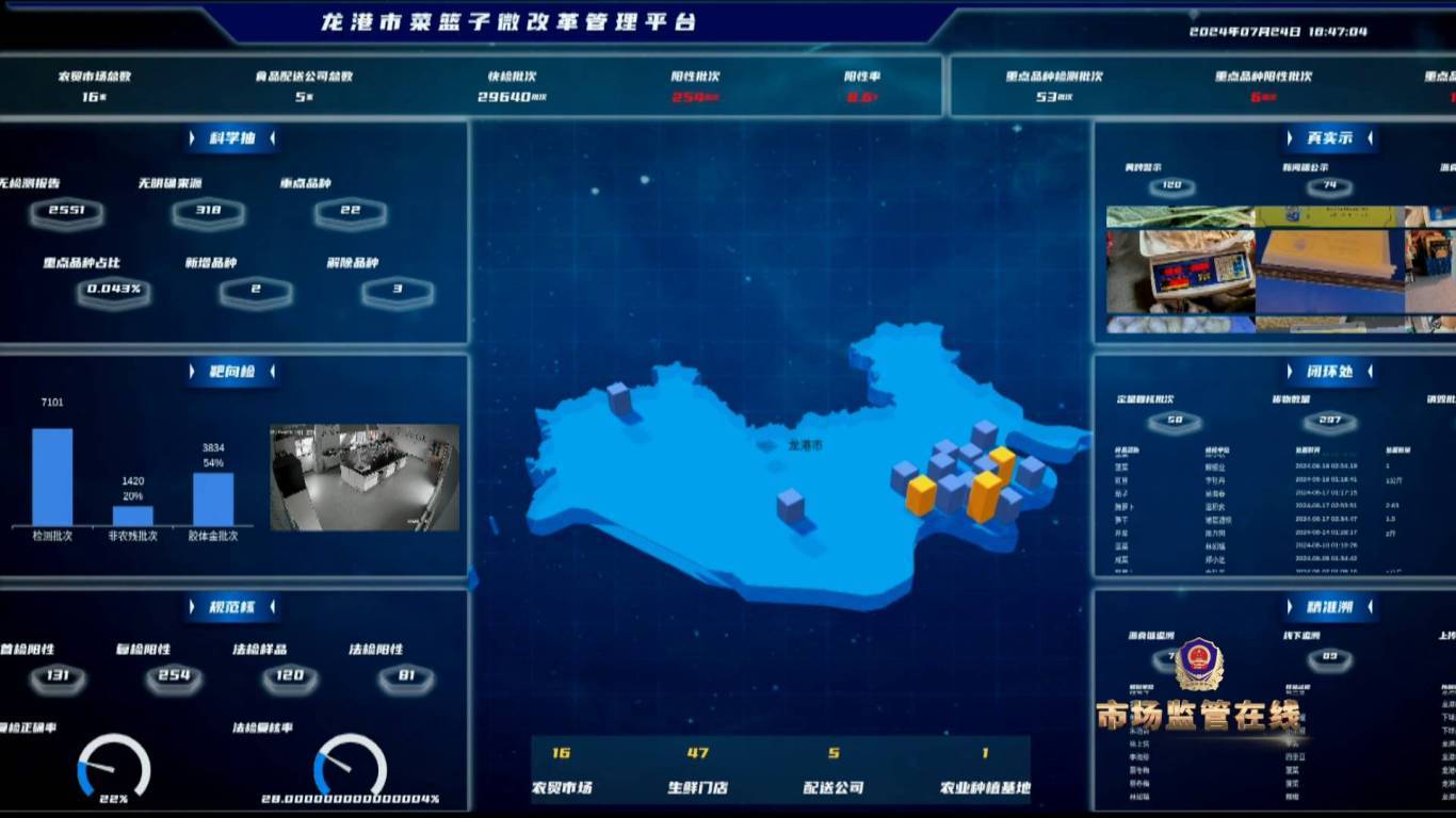 温州龙港市市场监管局食品监督管理科科长 钟锦铅:我们覆盖了16家农贸市场、47家生鲜门店、 6家大型商超、5家食材配送公司、1家农业种植基地、和百姓点检对象,监管快检、主体自检、第三方快检统一由实验室实施集成快检。
