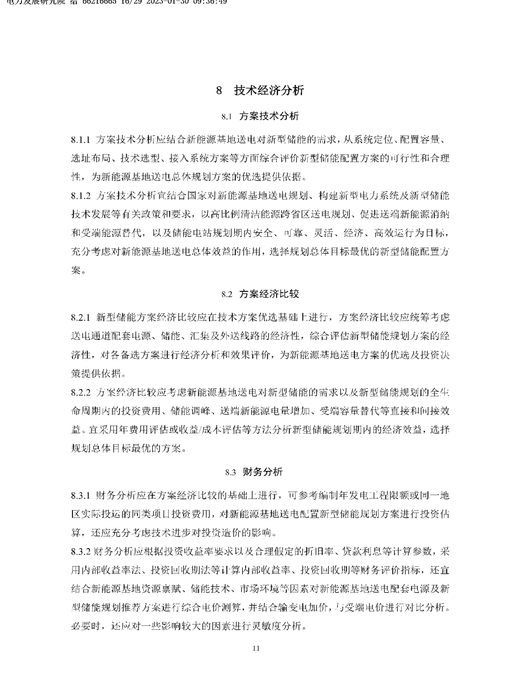 新型储能方案经济比较应在技术方案优选基础上进行,方案经济比较应统筹考虑 送电通道配套电源、储能、汇集及外送线路的经济性,综合评估新型储能规划方案的经 济性,对各备选方案进行经济分析和效果评价,为新能源基地送电方案的优选及投资决 策提供依据。