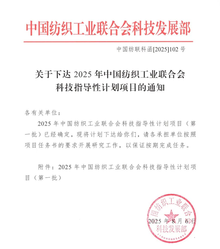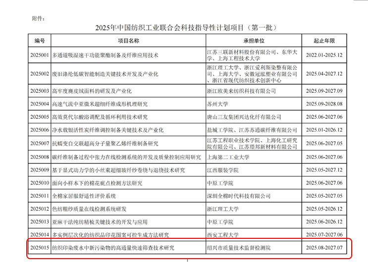 近日,中国纺织工业联合会科技发展部下达2025年中国纺织工业联合会科技指导项目(第一批)的通知,绍兴质检院主持的课题《纺织印染废水中新污染物高通量快速筛查技术研究》成功立项!