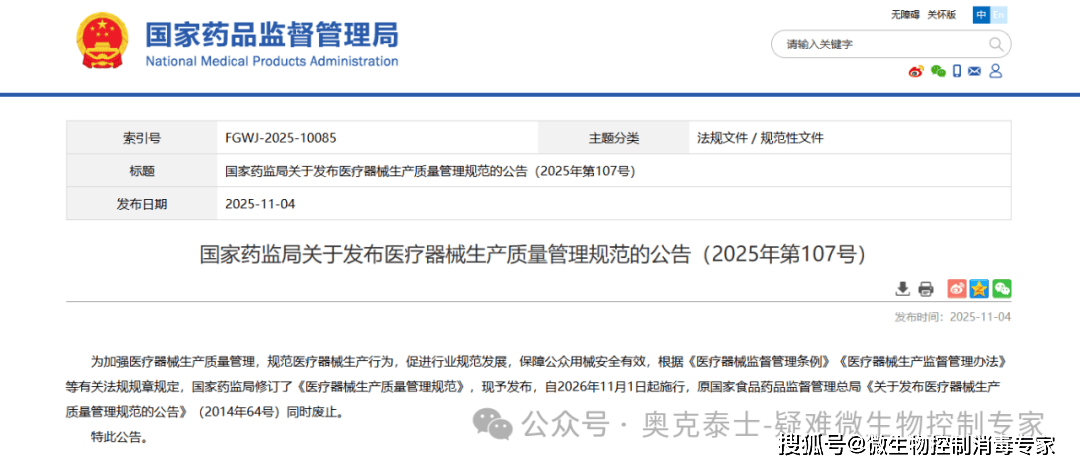 2025年11月4日,国家药品监督管理局发布新版《医疗器械生产质量管理规范》(以下简称《规范》),该规范将于2026年11月1日起正式施行,替代2014年发布的原版规范。